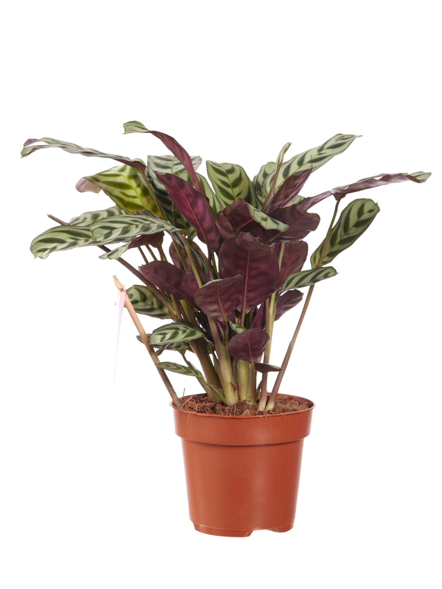 Mooie gestreepte bladeren met paarse onderkant. Gaat ’s nachts “slapen”.